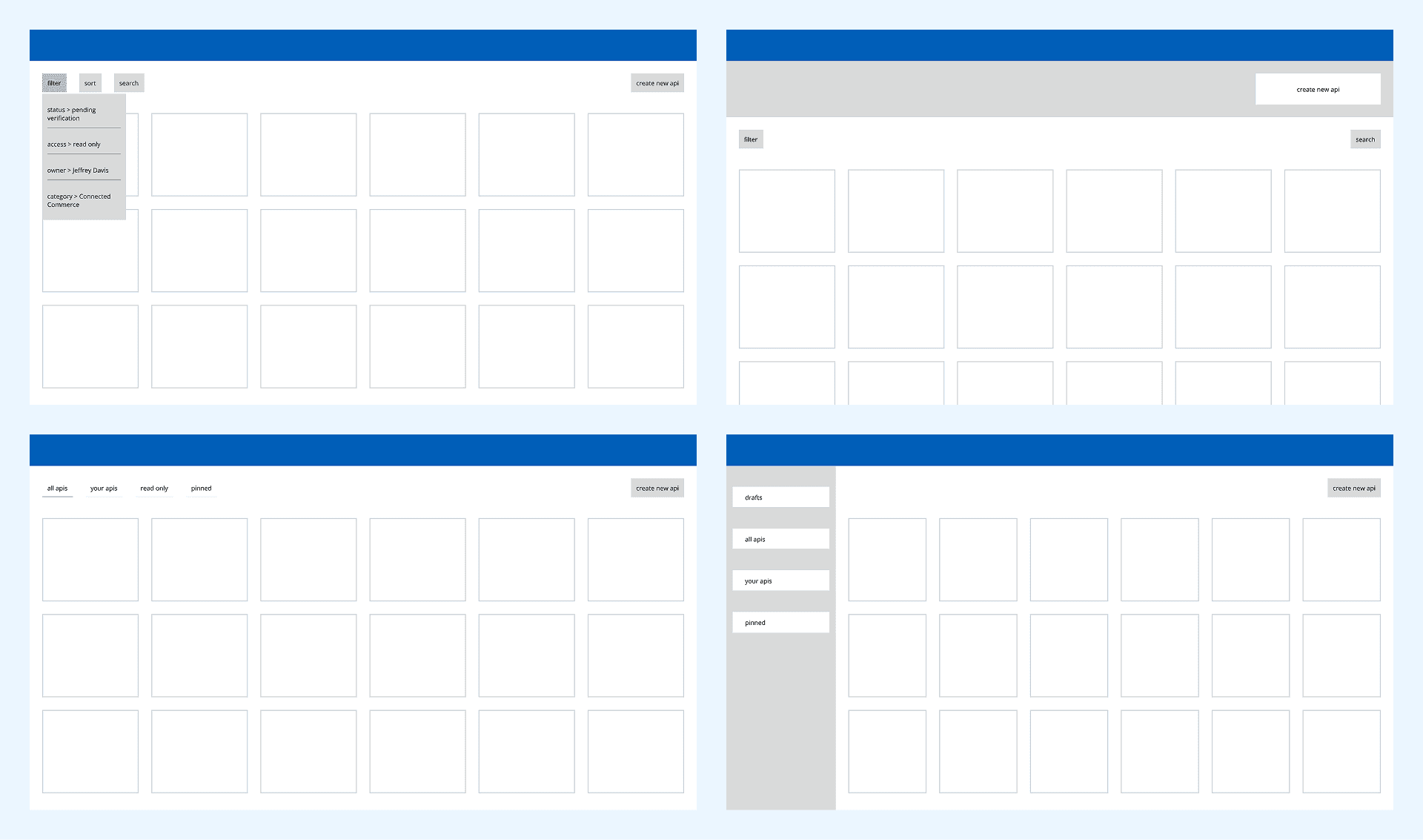 My strategy involved focusing on the high-level structure of the dashboard before dialing in on the details of each tile. I knew a search/filter functionality according to status and access would be imperative from previous research.