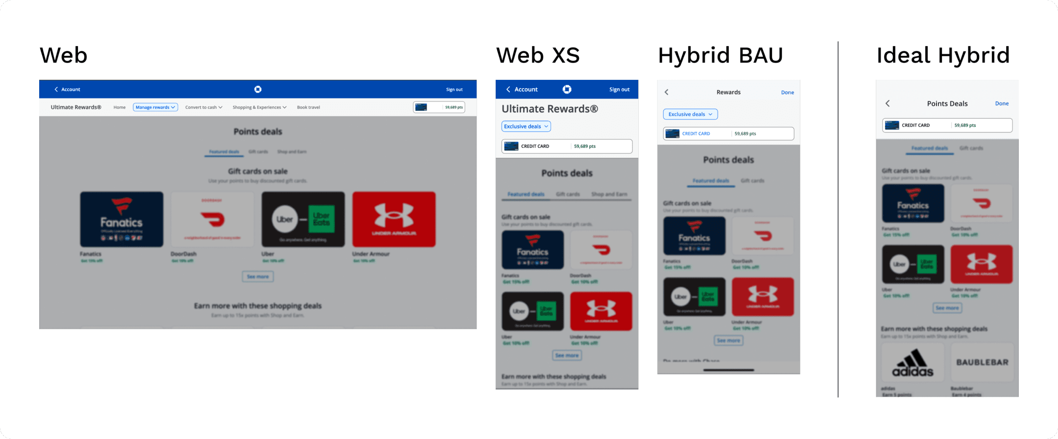 At Chase, some of my projects included working on the rewards mobile gift card flow and refining the navigation of this space. These two shorter snapshots of my time at Chase are shared here.